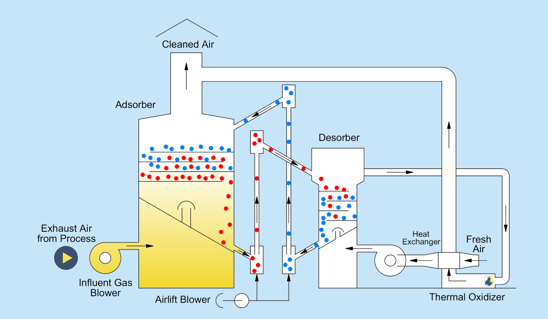 Desorber: Releases the emissions in a concentrated gas phase by heating the bead activated carbon.
